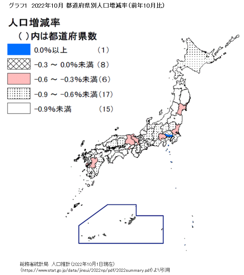 この見出しの文言は、2023年4月に総務省統計局が公表した人口推計(22年10月1日現在)の報道資料から引用したものである。相対的に出生率が高く、これまで人口増加を続けていた沖縄は、復帰50年で初めて減少になった。このことには多少驚きがあるものの、全国的な人口減・少子高齢化の流れの中に沖縄もあるということだろう。また、同じ資料で使用された都道府県別の人口増減率の地図を見ても、東京以外は減少になっていることが分かる=グラフ1=。東京は人口が増えているものの、その要因は社会増加(進学、就職などを理由にした転入が、転出を上回る状態)が多いためであり、他道府県同様、出生より死亡が上回る自然減少状態にある。47都道府県で最も出生率の低い東京に人が集まることは、少子化に輪をかけている可能性すらある。