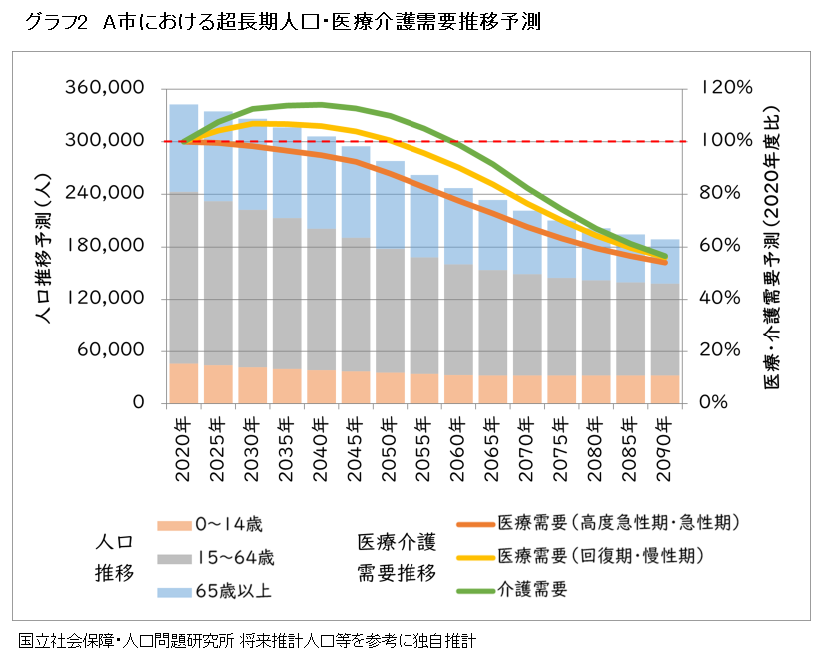 全国的に少子高齢化の進む日本において、今後の医療需要・介護需要は、緩やかに減少に転じるタイミングが見えてきた。人口30万人強のA市を例に、人口推移と医療介護需要推移を見た=グラフ2=。直近は回復期・慢性期医療需要や介護需要が増加している。一方、高度急性期・急性期需要については数値上大きな変化がないものの、徐々に減少していくことが想定される。