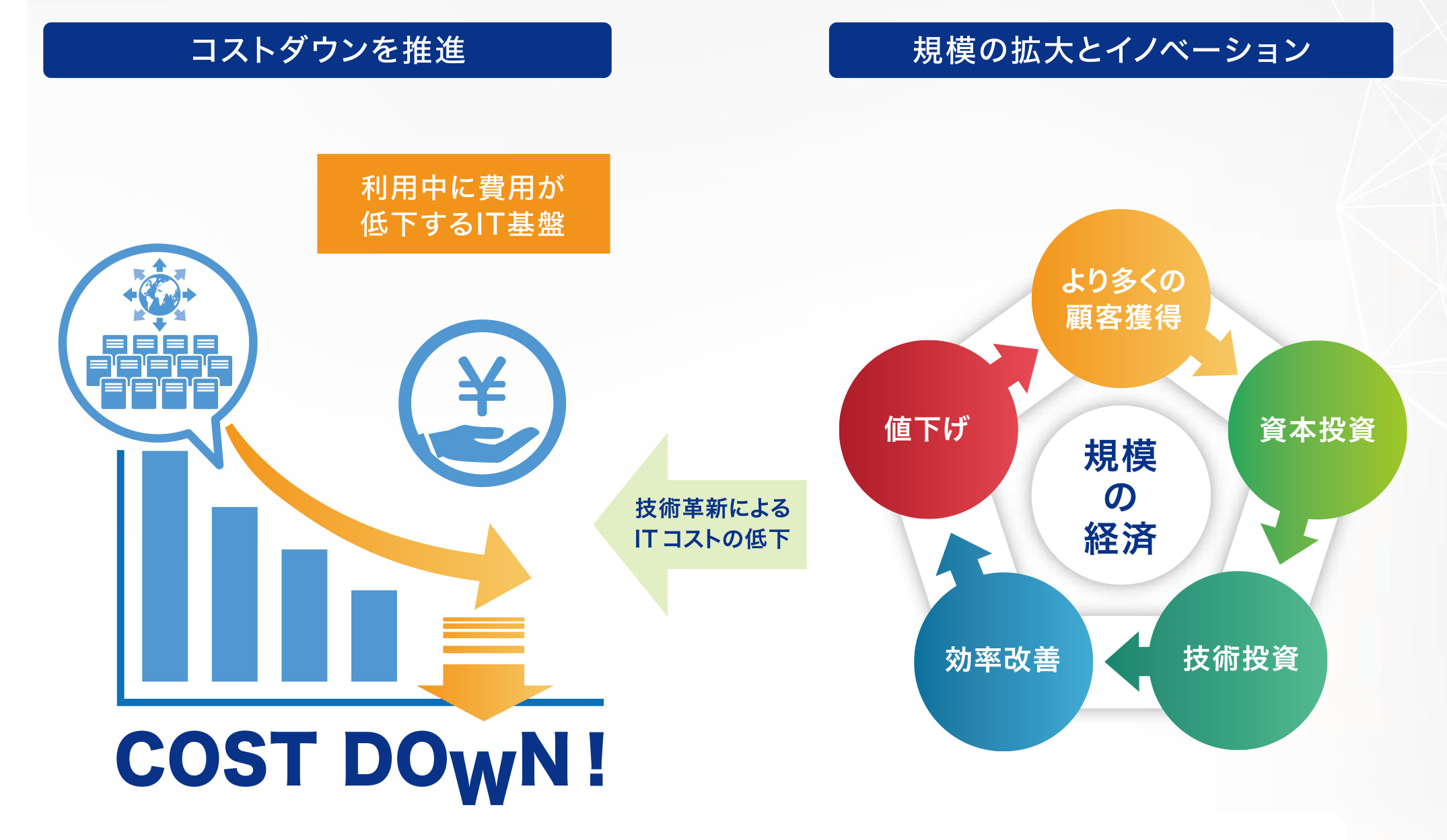 AWSの場合、世界中にデータセンターを持っており、調達能力も高いです。そのため、継続的に値下げをおこなっています。また、どういった機能が必要かというお客さまからいただいた要望を、私のようなソリューションアーキテクトがサービス開発チームに届け、サービスに反映させています。質を高めながら成長していくことで、低コスト化や新しい機能の開発が進み、顧客のメリットにつながるサイクルを構築しています。