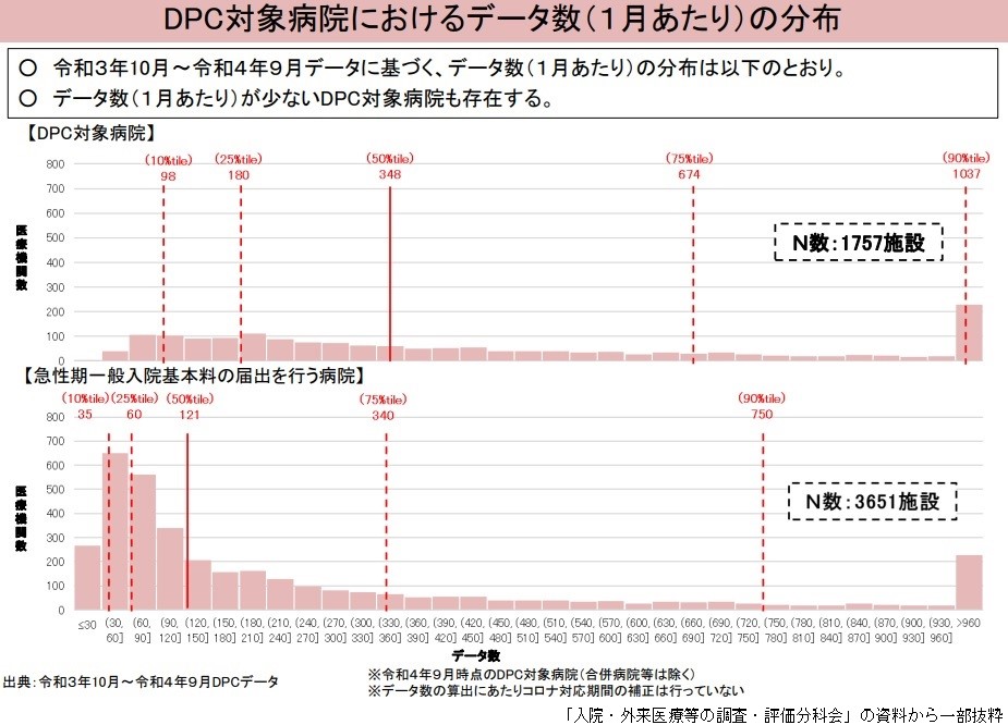 DPC病院は、対象期間の「1カ月当たりのデータ/病床比」を0.875以上にする基準を満たす必要がある。厚生労働省が2021年10月-22年9月のDPCデータを調べたところ、対象となった1,757病院の中に1カ月当たりのデータ数が少ない病院が一定数あった。
