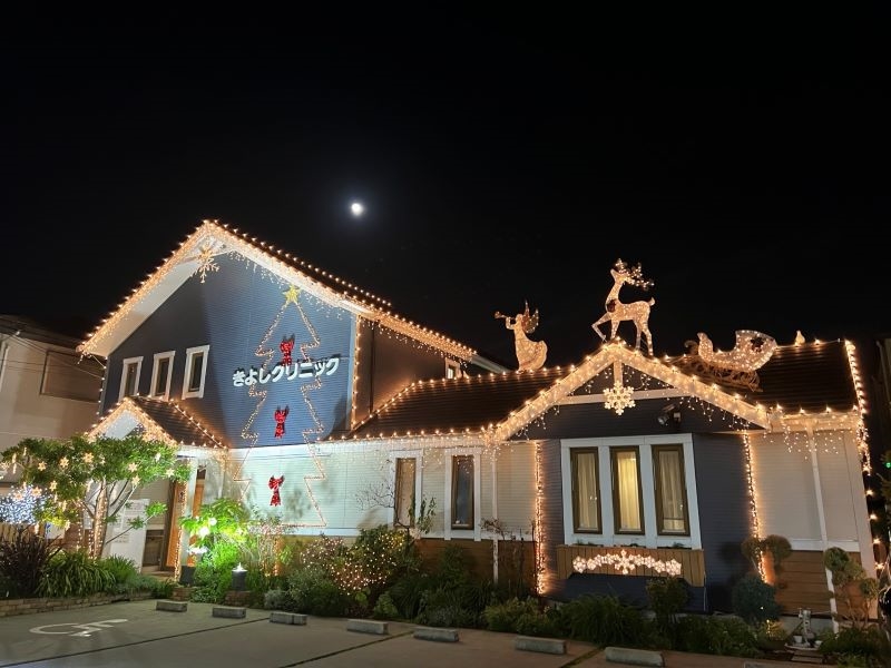 きよしクリニックは西大條理事長の父が1960年に開業。その後、土地の区画整理を受け、2011年に現在の場所へ移った。イルミネーションは移転・開業した年から始めたそうで、「木をふんだんに使ったスウェーデンハウスの建物がイルミネーションと良く似合う。スウェーデンハウスで建築されたクリニックさんもぜひやってみては」と微笑む。