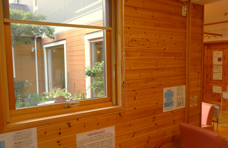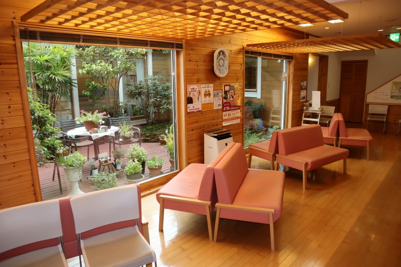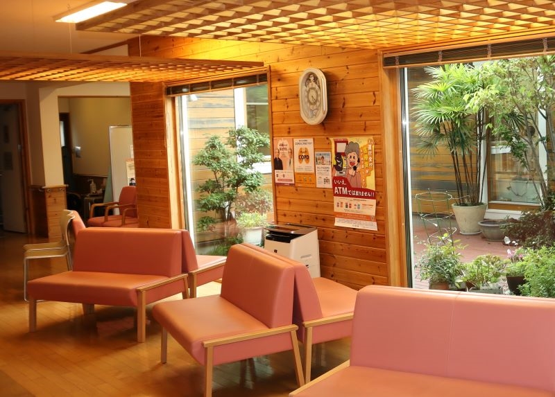 クリニックの中に入ると、広い待合室の大きな窓越しに中庭が見え、外観からは想像もできない新たな顔を覗かせる。中庭の樹木や鉢植えの花々も、きれいに手入れされている。診察までの不安な待ち時間を少しでも和らげようと、どの場所に座っても患者から中庭が望める設計だ。木をふんだんに使ったスウェーデンハウスの建物ならではの発案が、設計士からあったという。提案のイメージは森。