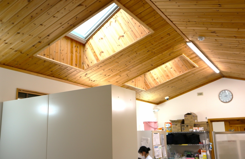 1階の事務室は、パイン材が張られた勾配天井が開放感のある空間を提供し、職員をリラックスさせる。勾配天井に施された天窓からは明るい光が差し込み、多くの時間を事務室で過ごす職員に温もりを与える。