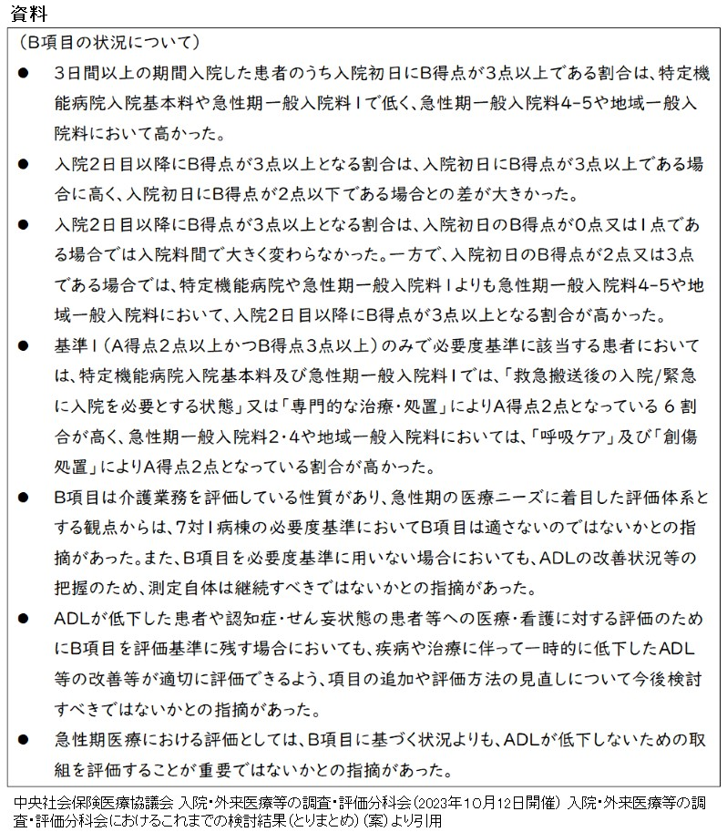 一般病棟用の「重症度、医療・看護必要度」(以下、看護必要度)に関する中央社会保険医療協議会での議論で、「B項目」の廃止論が出てきた。10月5日の「入院・外来医療等の調査・評価分科会」では、廃止論と慎重論があったことをCBnewsマネジメントでも報じていた(看護必要度「B項目」に廃止論 )。翌週10月12日の分科会のとりまとめ(案)=資料=では、B項目について黒丸の4つ目までが状況説明、5つ目から7つ目が指摘事項のまとめになっている。