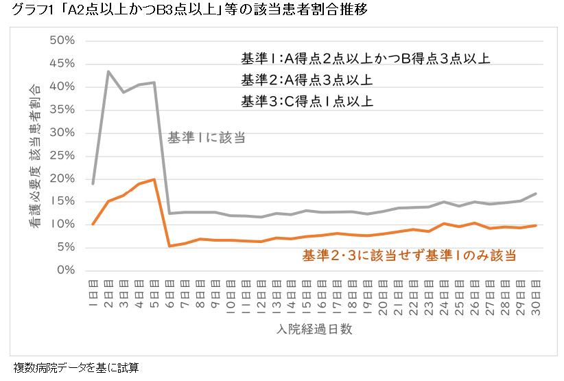 B項目の廃止の影響について考えるため、看護必要度の該当患者割合の入院経過日数による推移を見た=グラフ1=。中医協の資料では「A得点2点以上かつB得点3点以上」を基準1、「A得点3点以上」を基準2、「C得点1点以上」を基準3と呼んでいるため、それらに合わせて、基準1に該当する患者割合と、基準2と基準3に該当せず基準1にのみ該当する患者割合の推移を示した。