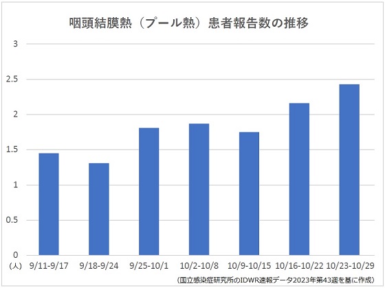 のどの炎症や結膜炎などの症状が出る咽頭結膜熱(プール熱)の第43週(10月23-29日)の患者報告数が、過去10年で最多を記録した前週を上回ったことが、国立感染症研究所が7日に公表した速報で分かった。過去10年最多を2週連続で更新しており、患者が増加傾向の自治体は警戒を強めている。【新井哉】
