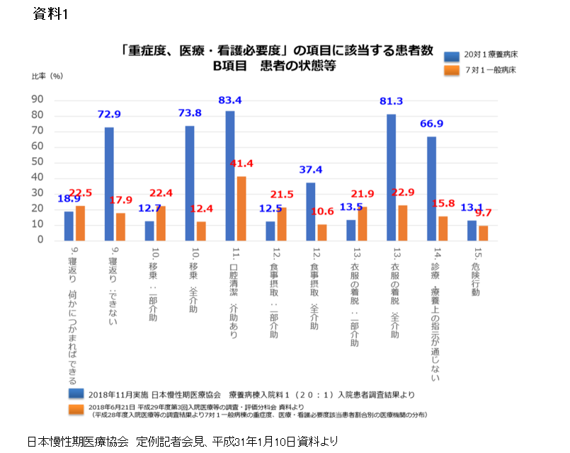 私がB項目を廃止した方がよいと主張した理由は、B項目は急性期らしい評価ではないことが一番の理由である。資料1は日本慢性期医療協会のデータであるが、B14の「診療・療養上の指示が通じない」などは20対1の療養病棟の方が、7対1の急性期病棟よりも圧倒的に高くなっている。