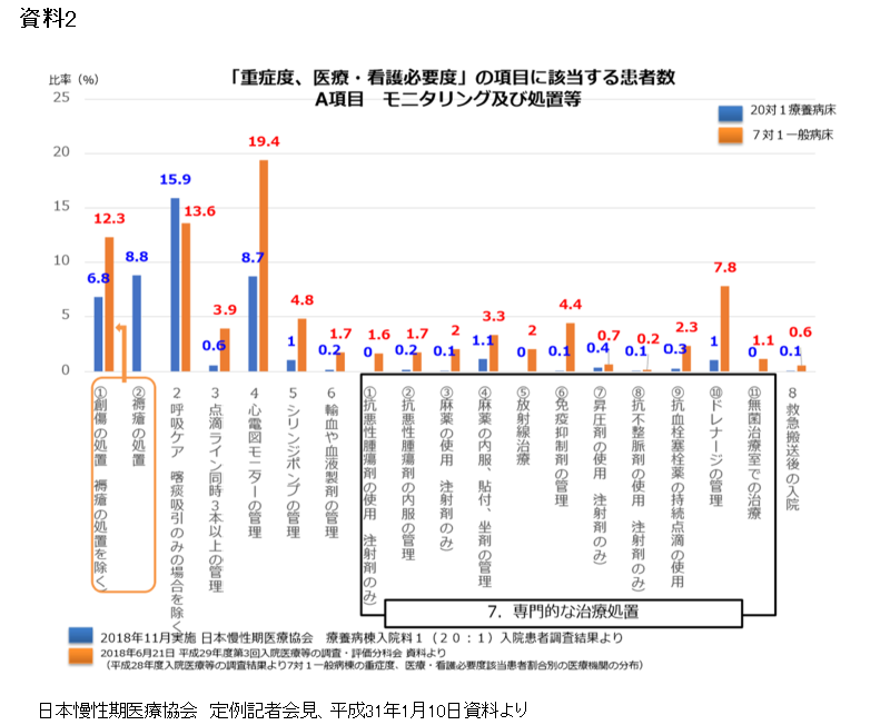さらに、資料2はA項目であり「心電図モニターの管理」は7対1の急性期病院で実施率が高く、これは、当時、B14・15に該当し、A項目1点以上かつB項目3点以上という基準があったが、心電図モニターの管理がA項目1点に該当することから、看護必要度を上げるために心電図モニターを付けている施設も存在するからだ。