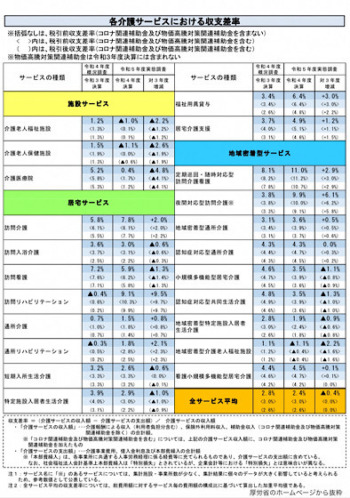 それによると、22年度決算における税引前収支差率(コロナ関連補助金と物価高騰対策関連補助金を除く)は、全サービス平均ではプラス2.4%で、前年度決算と比べ0.4ポイント悪化した。