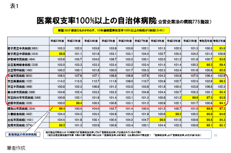 公立病院でも総務省の「病院経営分析比較表」によれば、医業収支比率が5年以上連続100%以上の病院が15病院あり、新型コロナ禍でも10年連続で医業収支比率100%以上の病院も3病院あります=表1=。