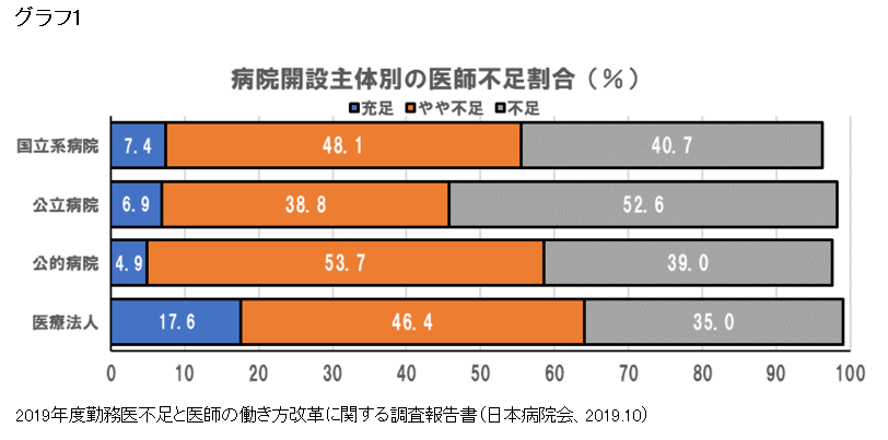 病院経営において重要な要素の1つが医師の確保です。どの病院も2004年から始まった新医師臨床研修制度以来、医師不足となり厳しい状況に。病院開設主体別の医師不足割合のアンケート調査でも、公立病院の医師不足の状況が明らかです=グラフ1=。