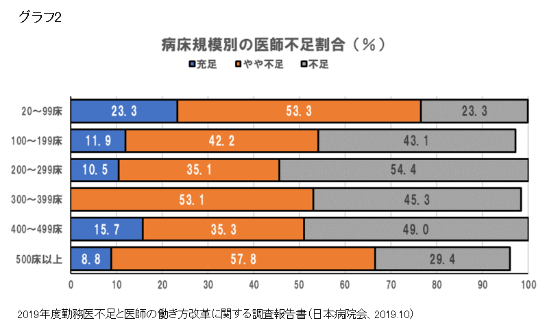 これを病床規模別に見ますと、中規模の病院で医師不足が顕著です=グラフ2=。