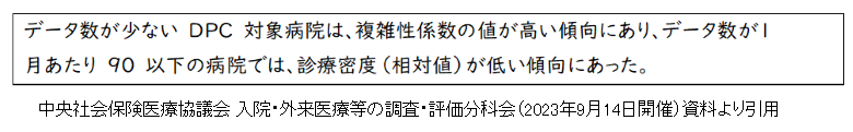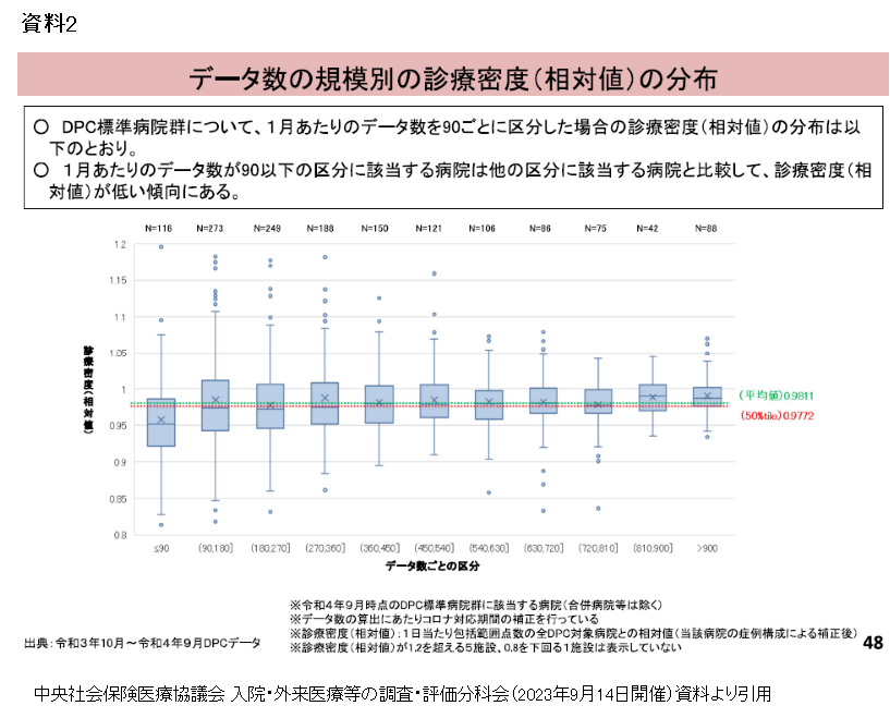 しかし、同時にデータ数の少ない病院は診療密度が低い傾向にあることも指摘されている=資料2=。