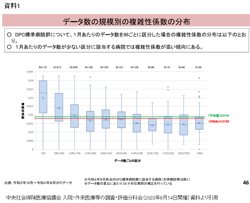 この資料1と2を見ると、データ数の少ない病院において、診療密度が低いのに複雑性係数が“不当に”高いと理解しそうになる。しかし、このような論理展開に強い疑問を感じる。なぜなら、議論に加わっている関係者が、資料1のデータ数と複雑性係数の関係性を適切に理解できていない可能性があるのではないだろうか。