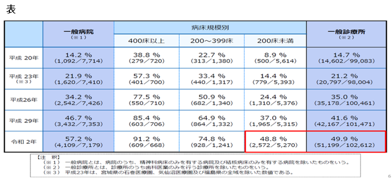 医療におけるDXの最も基本となるのは電子カルテの導入です。厚労省の医療施設調査によれば、病床規模別の電子カルテの普及は年々進み、20年の調査では400床以上では91.2%、200~399床では74.8%ですが、200床未満では、未だに48.8%にとどまっています=表=。離島やへき地など不採算地域での医療を担う中小規模が多い公立病院では大きな課題となっています。