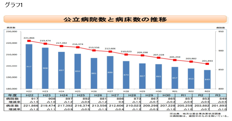 医師の働き方改革は、24年にいよいよ本格的に始まります。その前に考えておく必要があるのが、少子・高齢化の進展です。今後、医療を必要とする高齢者は増加しますが、医療現場で働く人材は不足することが予測されています。公立病院だけを見ても最近11年間で病院数の減少は68病院、総病床数は1万9,973床にすぎず、今後病院における人材不足が深刻になることは明白です=グラフ1=。