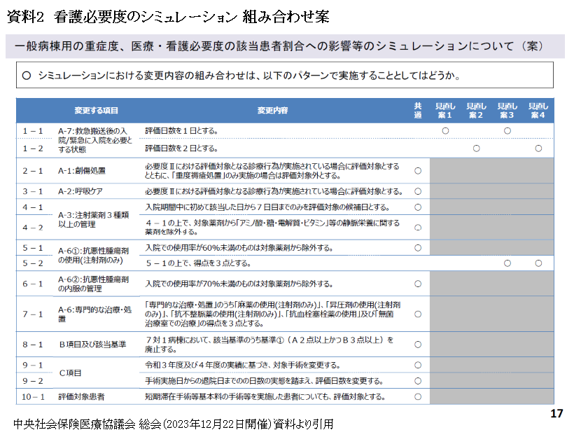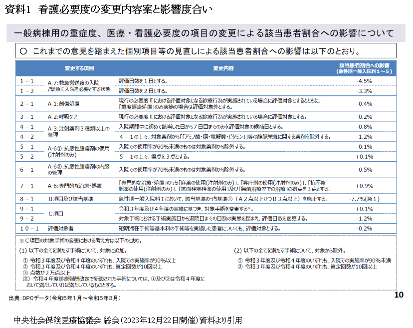 これまでの議論を踏まえ、看護必要度の見直し案が2023年12月22日に示された=資料1=。内容は1-1から10-1まで多岐にわたり、自院への影響はおろか、そもそもの個々の内容を把握することさえ大変な状況となった。