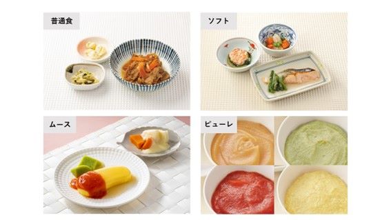 3つ目は、利用者の状態に応じた食の提供だ。高齢者施設では、利用者の嚥下の状態に合わせた食事の提供は必須であり、全国の工場に支えられ、「普通食」「ソフト」「ムース」「ピューレ」の4つの食形態を用意する。渡辺氏は「普通食を手作業で細かく刻んで対応している施設も多いが、上手に刻むことが難しく、ミキサーにかけると塊が残ったり、何を食べているかわからないと利用者が食事を残してしまったりすることがあります。嚥下に合わせて現場で対応するのは労力がかかるうえにハードルが高いです」と現場の課題を語る。