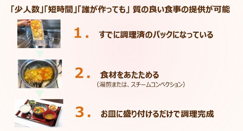 「デリパック」を使えば、献立作成や食材の下処理・調理・味付けの対応が不要になる。調理技術のないスタッフでも対応ができるため、厨房の人員配置の改善につながるという。