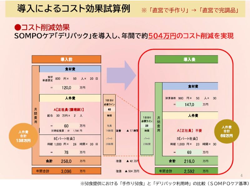 SOMPOケアソリューション事業部営業1課長の渡辺大輔氏は「導入した施設の中では、食事提供にかかるコストを年間約500万円削減できた所もあります=図=。