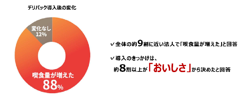 もっとも調理時間が短縮できても、利用者の食事に対する満足度が下がっては元も子もない。「デリパック」を導入した施設17法人に取ったアンケートによると、88%の法人で喫食量が増えたという。