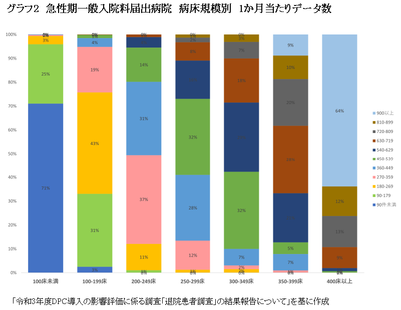 グラフ2は、病床規模別に1カ月当たりの一般病棟に入棟した患者数を見たものであり、DPC算定病床が100床未満の病院では月90件未満が70%を超えている。