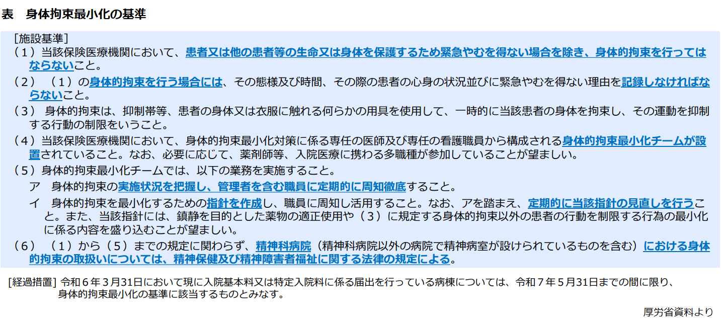 ただ、精神科病院や、精神病室がある精神科以外の病院での身体拘束にはこれらのルールは適用せず、厚労省は「精神保健や精神障害者福祉に関する法律の規定による」としている。
