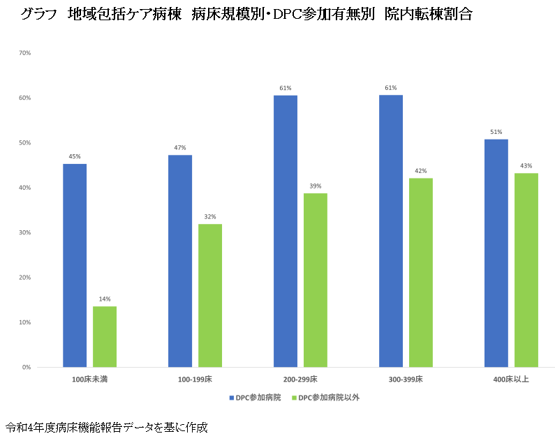 グラフは、病床規模別・DPC参加有無別の地域包括ケア病棟における院内転棟割合を見たものであり、DPC病院、特に200床以上の病院において高い水準となる。