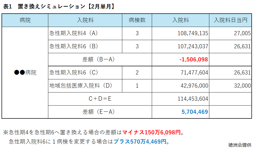 2月分の実績データ(単月)で行ったシミュレーションでは、急性期一般入院料6に3病棟全てを移行させると1カ月当たり150万円超の減収になるが、入院料6を2病棟、地域包括医療病棟入院料を1病棟の構成にすると、従来に比べて570万円ほどの増収を見込めることが分かった=表1=。