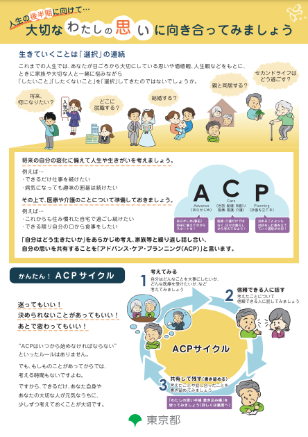 ACPとは、将来の自分の変化に備えて、「何を大事にしたいか」「どんな医療を受けたいか」などを家族や医療・介護関係者らと繰り返し話し合い、自分の思いを共有するプロセスのこと。都は、住民が希望する医療・介護を受けられるよう、ACPの普及啓発を推進している。
