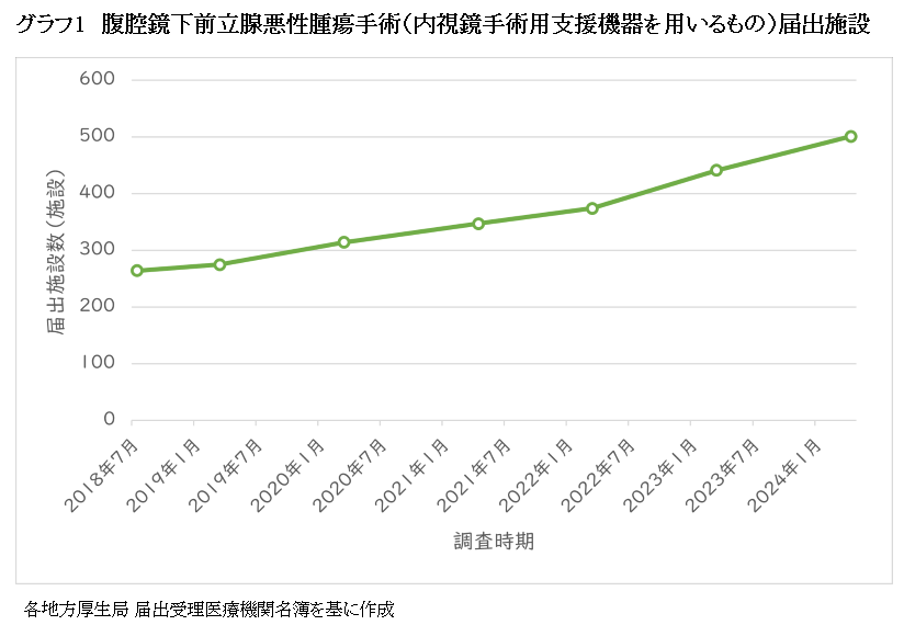厚生局の届け出受理医療機関名簿を基に、直近5年程度の内視鏡手術用支援機器の導入施設数の推移を見た=グラフ1=。なぜ前立腺がんの届け出を見ているかは、内視鏡手術用支援機器に関し、最も届け出施設数が多く、保険診療における代表的な適用例であるためだ。18年7月調査時点では250施設強であったのに対し、直近は500施設を超えた。約5年で2倍に増えたことになる。