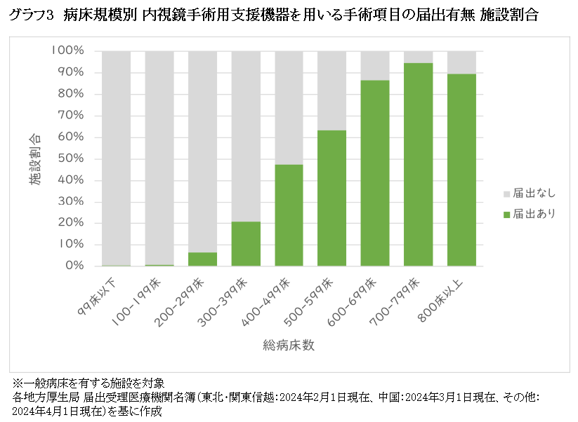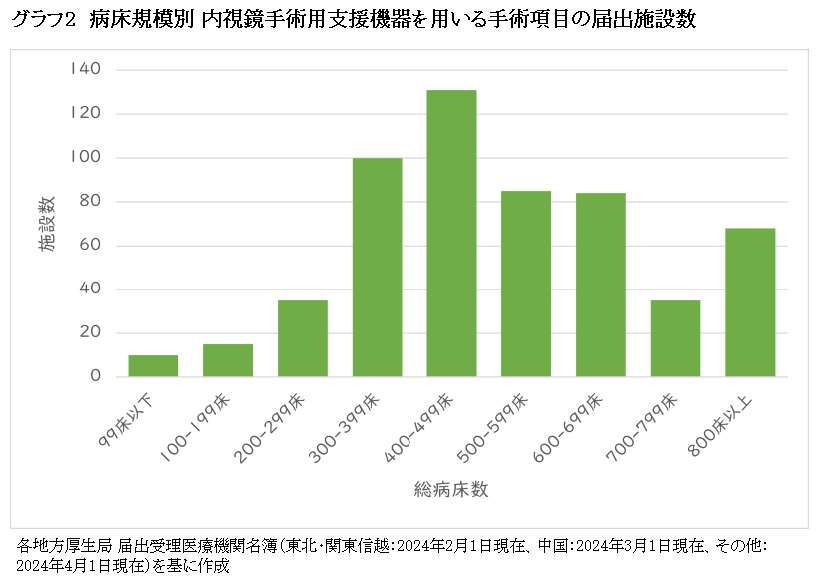 保険診療の届け出項目という限定的な側面ではあるものの、正確な導入施設数を把握するため、内視鏡手術用支援機器の20数項目の届け出状況を見たところ、全国で563施設が保険診療のための届出を行っている=グラフ2=。病床規模を見ると、届け出は総病床数300床以上の施設が中心である。ただし、施設数は少ないものの99床以下や100床台の施設でも届け出を行っていることが分かる。