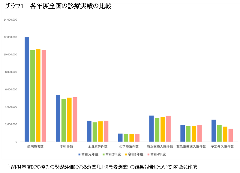 グラフ1は全国の診療実績を年度ごとに見たものであり、退院患者数は19年度と22年度を比較すると12%減少している。ただし、全身麻酔件数はわずかだが増え、救急車搬送入院や救急医療入院のような重症な救急患者の減少はそれほどでもない。しかしながら、救急医療入院以外の予定外入院の減少は続き、コロナ前よりも40%以上減ったことになる。