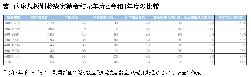 これを病床規模別に見ると、400床以上ではコロナ前と比較し、順調に患者数を戻しているが、中小病院は厳しい状況に置かれていることが分かる=表=。
