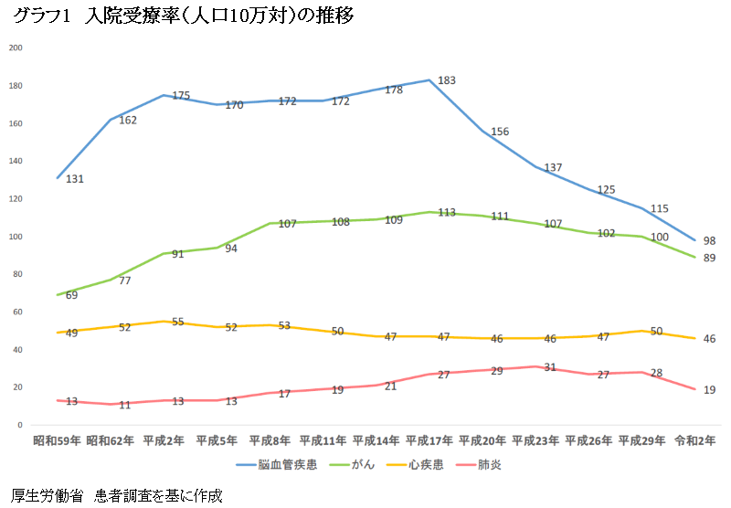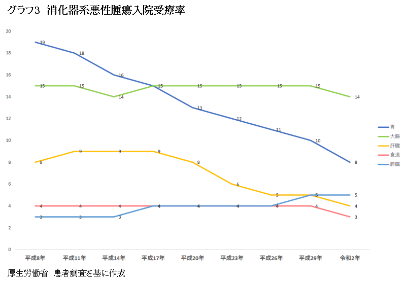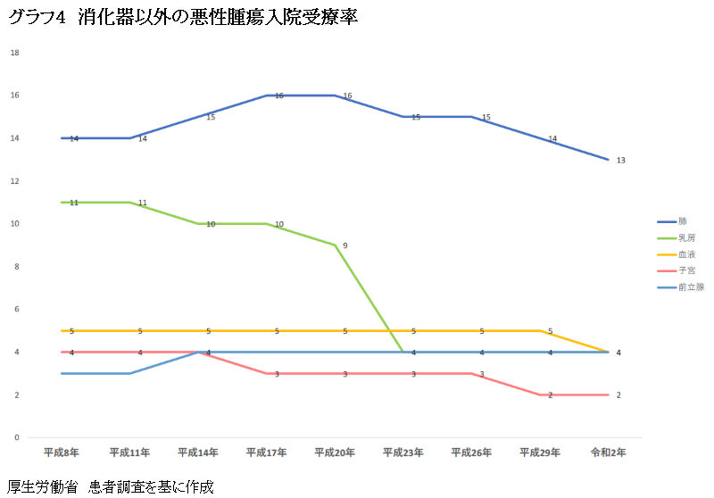 ただし、部位別に見ると胃や肝、管内胆管の悪性腫瘍のように入院受療率が激減している疾患もあれば、大腸がんや肺がんのようにほぼ変わらない領域も存在する=グラフ3・4=。