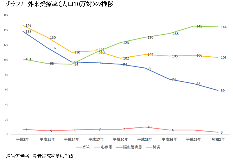 グラフ1は、厚生労働省が3年に1回実施する患者調査で示された入院患者の受療率であり、がん患者は頭打ちの傾向にあるものの外来化が進み全体としては増加傾向にある=グラフ2=。