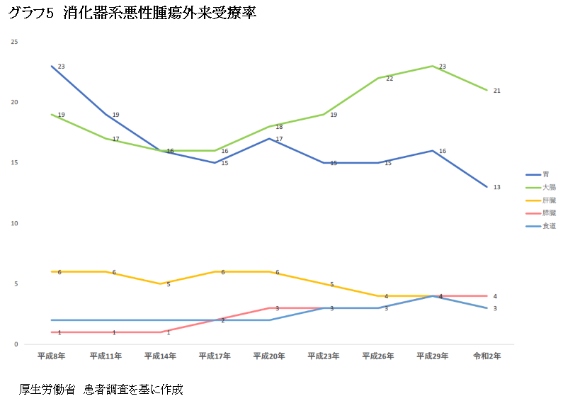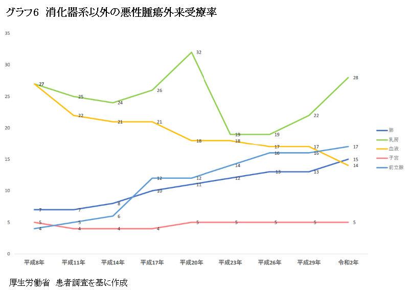 これらは、在院日数の短縮や手術の低侵襲化、外来化などの影響を受けており、その影響の程度も疾患によって異なるかもしれないが、受療率の変わらない疾患は発症が増えていることになる。なお、外来については全体的に増加傾向にあるが、胃の悪性腫瘍と血液および造血器の疾患並びに免疫機構の障害の受療率は低下し続けている=グラフ5・6=。
