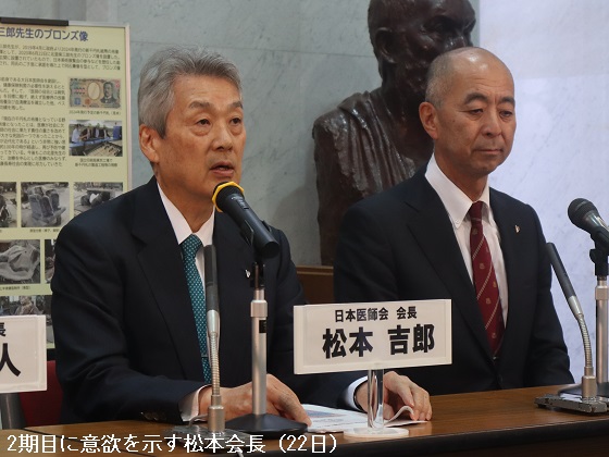 日本医師会の松本吉郎会長は、22日の会長選で2期目の当選を果たした後の記者会見で、2024年度の診療報酬改定について「課題もたくさん頂戴している」とした上で、厚生労働省などとの話し合いの場を設けて「修正できるところは期中での修正を図りたい」と述べた。また、次の報酬改定に向けて物価高騰へのさらなる支援を国に働き掛ける考えも示した。【松村秀士】