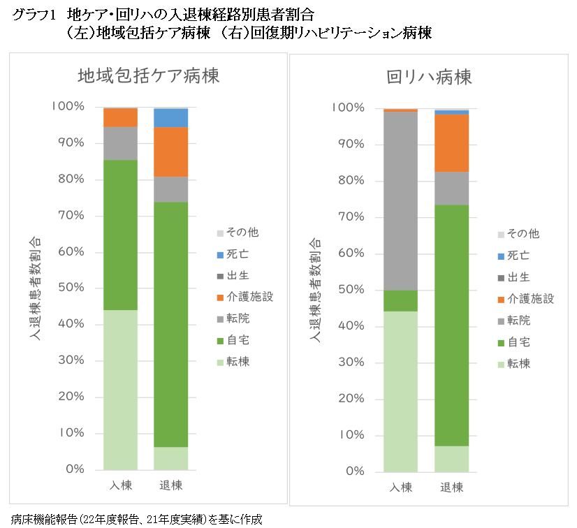 2つ目は、地域包括ケア病棟や回復期リハビリ病棟の“出口問題”である。これらの病棟の入院患者は病態によって自宅に帰ることは難しく、療養病棟や介護施設などへ移ることが少なくない。病床機能報告(22年度報告、21年度実績)で地域包括ケア病棟や回復期リハビリ病棟の入退棟ルートを見ると、地域包括ケア病棟からの退院先は介護施設が15%程度、転院が5%程度。回復期リハビリ病棟は介護施設が20%弱、転院が10%弱となっている=グラフ1=。