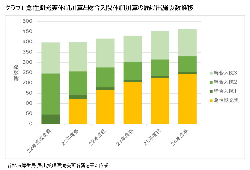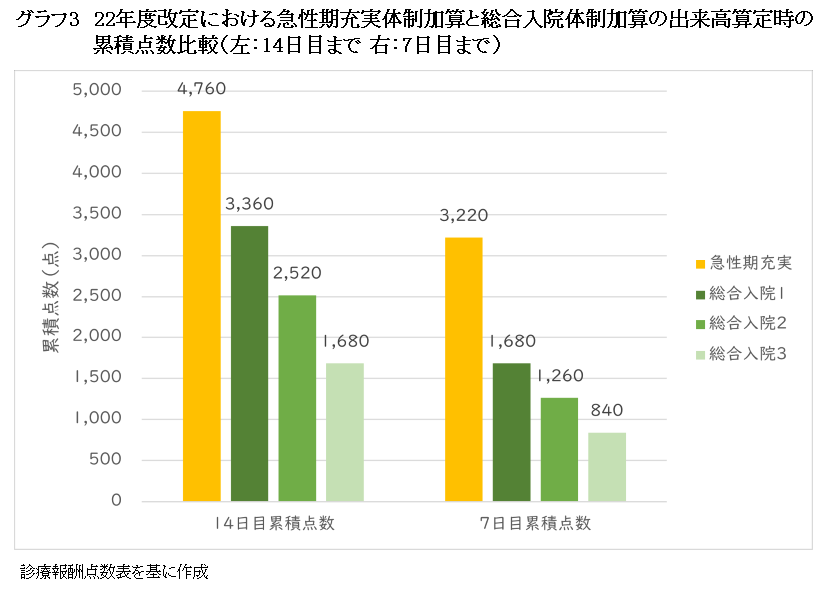 グラフ2で示すように、総合入院体制加算から急性期充実体制加算へ切り替えが進んだのは、診療報酬上の点数設定にある。
