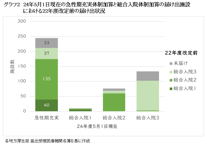 急性期充実体制加算の届け出を行っている245施設は、総合入院体制加算から切り替えたところが多くを占めている。具体的には、総合入院体制加算1から40施設、総合入院体制加算2から135施設、総合入院体制加算3から37施設が、それぞれ急性期充実体制加算に切り替えている=グラフ2=。また、22年度改定以前には総合入院体制加算を届け出ておらず、新たに急性期充実体制加算を届け出た所が33施設ある。総合入院体制加算は小児科や産科・産婦人科を標榜し、入院医療を提供している必要があるため(ただし、地域医療構想調整会議で合意を得た場合に限り、標榜・提供していなくてもよい)、届け出を断念していた所があると認識している。 (残り1653字 / 全2520字) 次回配信は8月7日5:00を予定しています