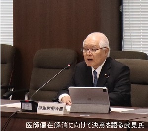 特定の地域や診療科への医師の偏在是正に向けて、厚生労働省は5日、「医師偏在対策推進本部」の初会合を開いた。本部長を務める武⾒敬三厚労相は冒頭、「医師偏在問題の解消なしに、国民皆保険制度を維持することはできないという切迫感を持っている」と述べ、経済的なインセンティブや規制的な手法などを組み合わせた具体的な検討を加速させる考えを示した。【渕本稔】