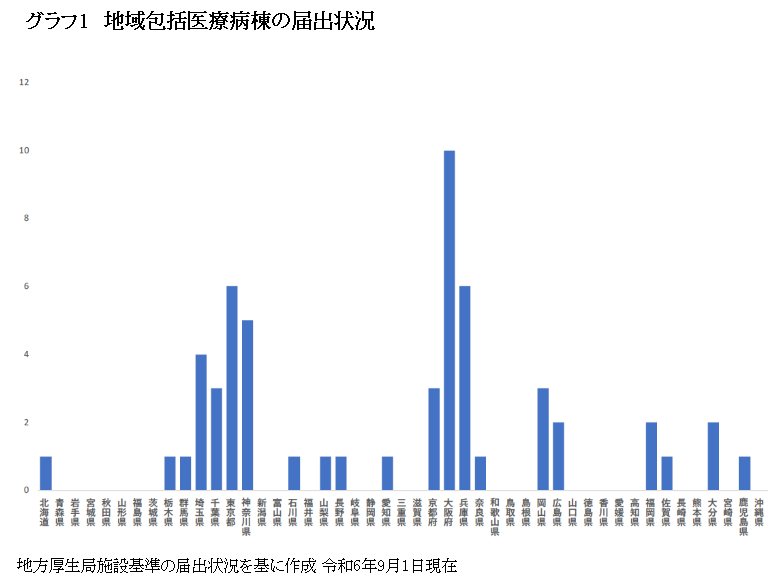 2024年度診療報酬改定で高齢者救急の主な受け手として新設された地域包括医療病棟は厳格な施設基準も影響し、届け出に二の足を踏む医療機関も多いようだ。グラフ1は、都道府県別の届け出数であり、100病院に満たない状況(9月1日現在)だ。