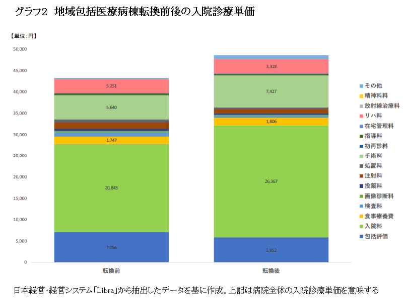 グラフ2は、地域包括医療病棟の転換前後の患者1人1日当たりの診療収入である入院診療単価について病院全体の値を比較したものである(※n=11)。
