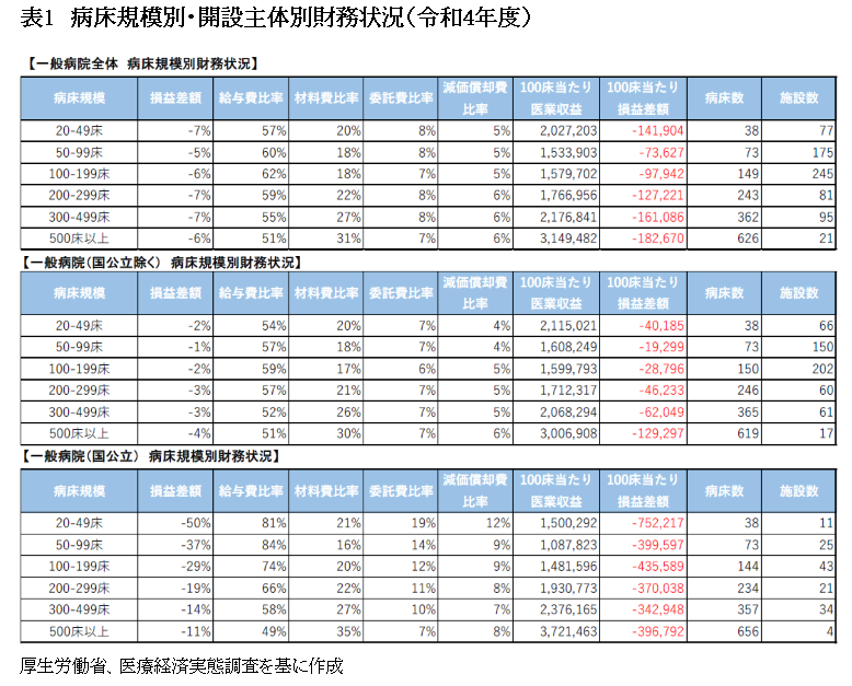 急性期病院の財務状況が悪化の一途をたどっており、このままだと立ち行かなくなることは明らかだ。2022年度の医療経済実態調査から、一般病院全体と国公立を除く一般病院、国公立病院のみの財務データを病床規模別に大まかに推計した=表1=。