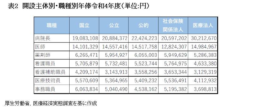 次に国公立除く病院と国公立病院を比較すると国公立病院の損益差額のマイナスが著しい。なお、この財務状況の違いが生じるのは、国公立病院は急性期志向が強く、病床利用率が上がらないことに加え、そもそも回復期や慢性期医療の方が急性期よりも収益性が高いことが関係している。さらに、国公立の看護師やメディカルスタッフなどの給与費額が高いことも背景にある=表2=。