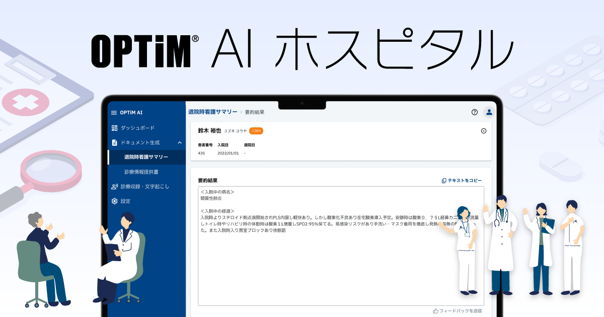 カルテのみでなく、診療情報提供書や入退院時看護サマリーなど、医療現場では文書作成業務が日々発生する。それに対して生成AI技術を活用し、医療現場のDXを推進する医療支援サービスがオプティム(東京都港区)の「OPTiM AI ホスピタル」だ。