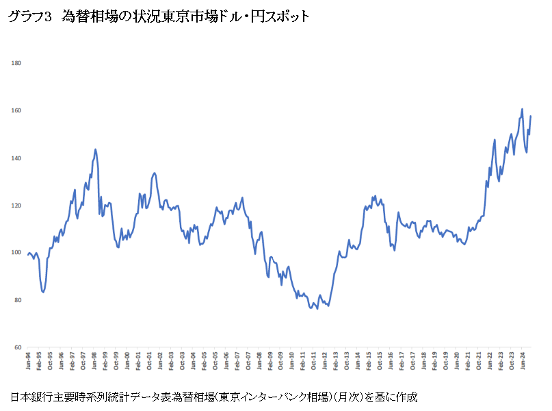都心部ではハイオクガソリンの店頭価格が200円を超える場所もある。輸送価格が上がることを意味するわけだから、病院の材料などの価格交渉は、今まで以上に厳しくなる。加えて、24年は医師だけでなく、トラックドライバーにも働き方改革が適用されており、時間外労働規制の影響も病院の仕入れ改革に影響を及ぼすだろう。さらに、為替相場を見れば円安が進行しており、輸入品に依存せざるを得ない医療界にとっては致命的になりかねない=グラフ3=。
