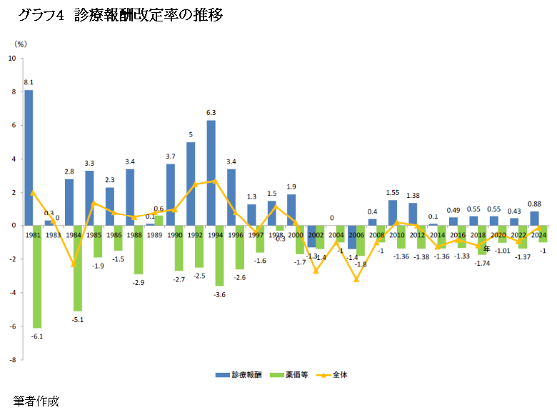 これに対して24年度診療報酬改定では、財源が制約される中、本体0.88%のプラス改定となった=グラフ4=。しかし、多くの財源が賃上げに充当され、賃上げをすればさらに持ち出しになってしまう。