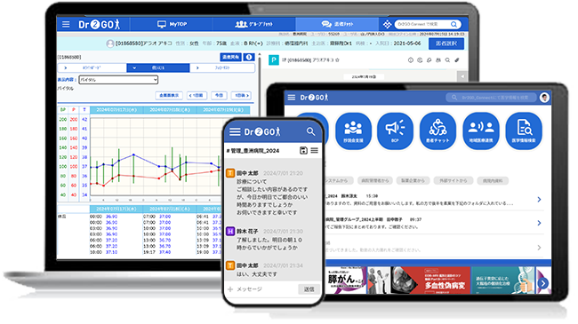 「Dr2GO」はiPhone、iPad、電子カルテPCでの利用が可能。複数の種類の端末に対応し、医療従事者は場所や時間を問わず、必要な情報に迅速にアクセスできる。電話や対面の会話を、気軽にいつでも返信できるチャットに置き換え、情報共有の無駄をなくし、業務の効率化を行う。